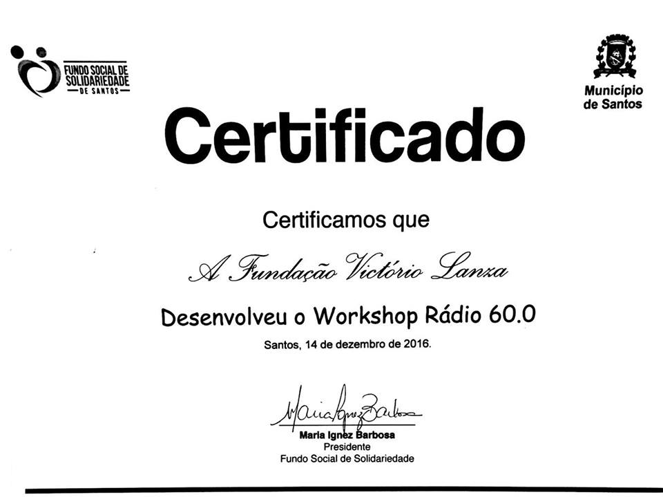 Voltar FVL recebe certificado da Prefeitura Municipal de SantosA Fundação Victório Lanza, durante solenidade no Teatro Guarany, recebeu certificado por ter desenvolvido o Workshop Rádio 60.0.