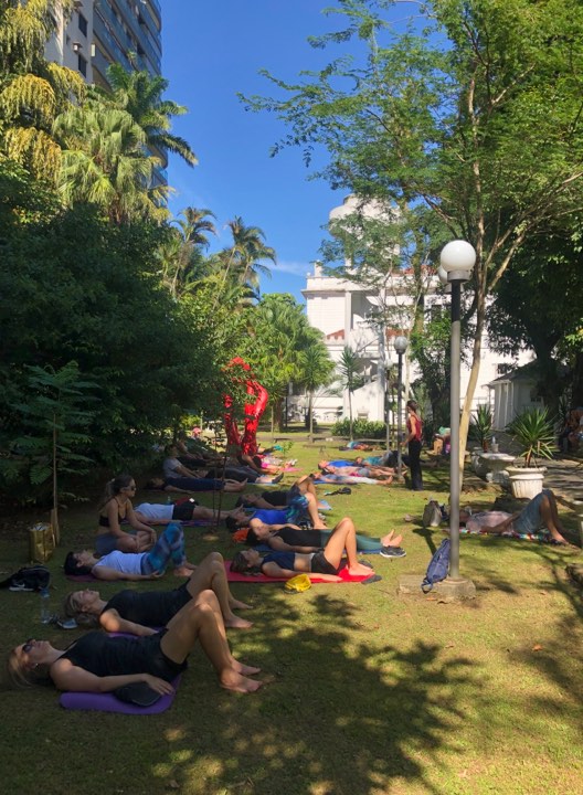 Com o sol para nos prestigiar, nossa segunda sessão de alongamento foi realizada no lindo jardim da Pinacoteca Benedicto Calixto e a manhã transcorreu de forma divertida e relaxante.