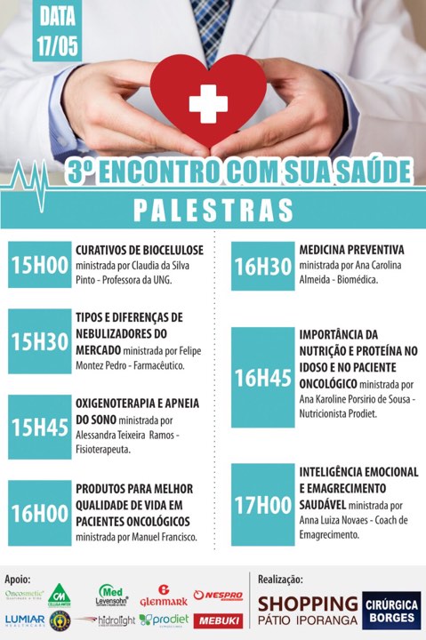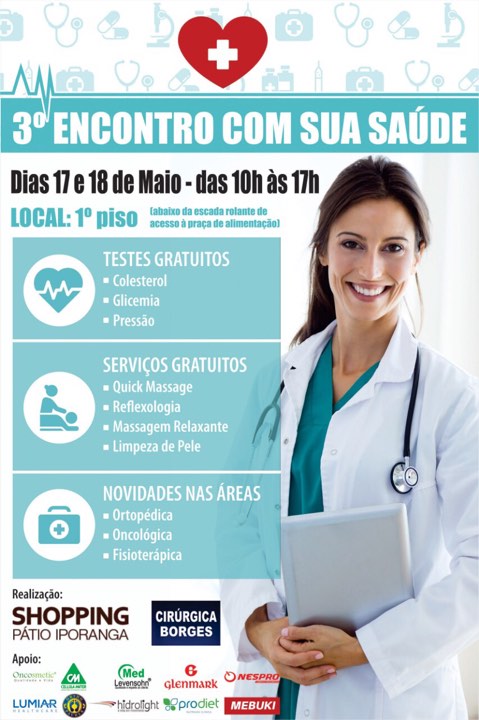 Para incentivar a prática regular dos exercícios físicos com segurança, nos dias 17 e 18 de maio, das 10h às 17h, a Cirúrgica Borges, em parceria com o Shopping Pátio Iporanga, reuniu empresas ligadas à saúde e bem-estar para proporcionar gratuitamente aos visitantes diversos testes avaliativos de saúde e capacidade física.