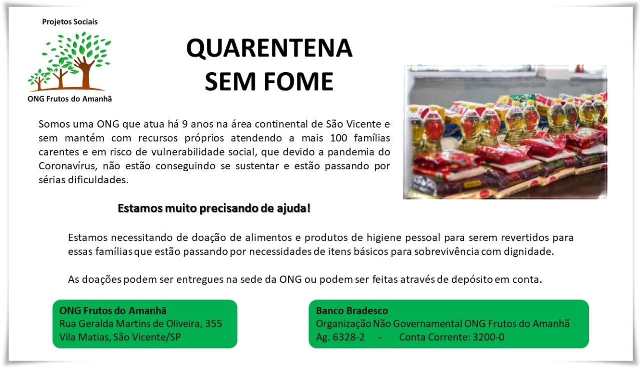 Com isso a ONG pediu doação de alimentos e produtos de higiene pessoal para serem revertidos para essas famílias. As doações foram entregues na sede da ONG - situada na Rua Geralda Martins de Oliveira, 355 - Vila Matias - São Vicente (SP).