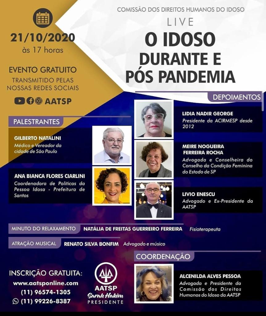 "O Idoso Durante e Pós Pandemia" foi o tema abordado pelos palestrantes: Gilberto Natalini - Médico e Vereador da cidade de São Paulo e Ana Bianca Flores Ciarllini - Coordenadora de Políticas da Pessoa Idosa da Prefeitura de Santos. A coordenação foi de Alcenilda Alves Pessoa - Advogada e Presidente da Comissão dos Direitos Humanos do Idoso da AATSP.