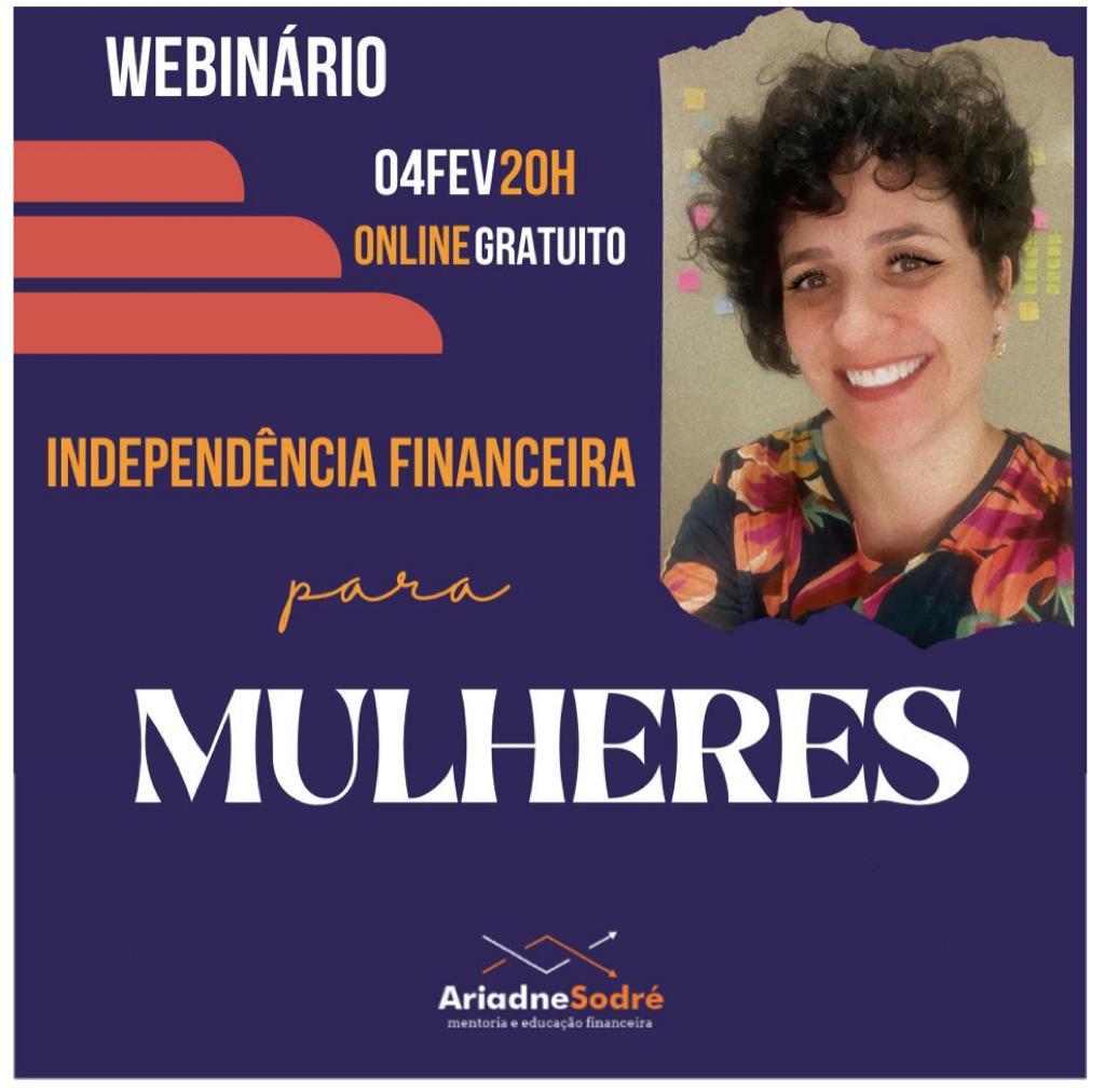 Com o tema Independência Financeira para Mulheres o webnário aconteceu no dia 04 de fevereiro de 2021, ás 20 horas com Ariadne Sodré, que está no mercado financeiro há 15 (quinze) anos e hoje trabalha com Educação em Finanças Pessoais de uma forma simples e descomplicada.