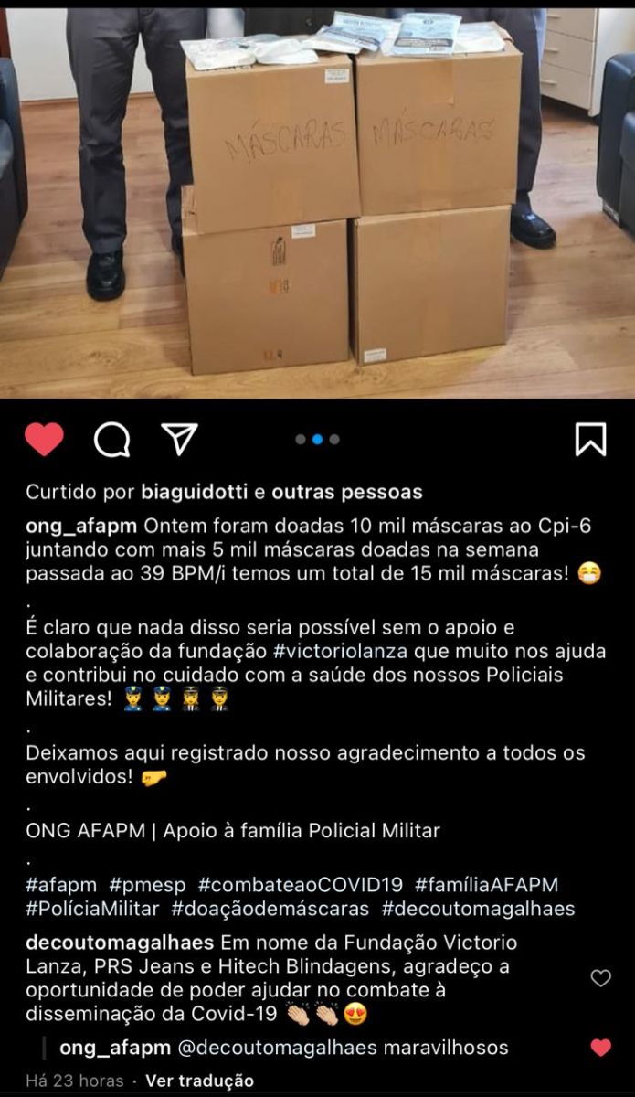 Voltar FVL e parceiros seguem no combate a disseminação da Covid-19A Fundação Victório Lanza, através das rádios Saudade FM e Blue Med 013 FM e mais dois parceiros - PRS Jeans (Indigo Red) e Hi Tech Comércio Serviços de Blindagem, no intuito de ajudar no combate a disseminação do novo coronavírus (Covid-19), distribuíram - na segunda - (12/04/2021) - 30.000 (trinta mil) máscaras descartáveis para a ONG-AFAPM.