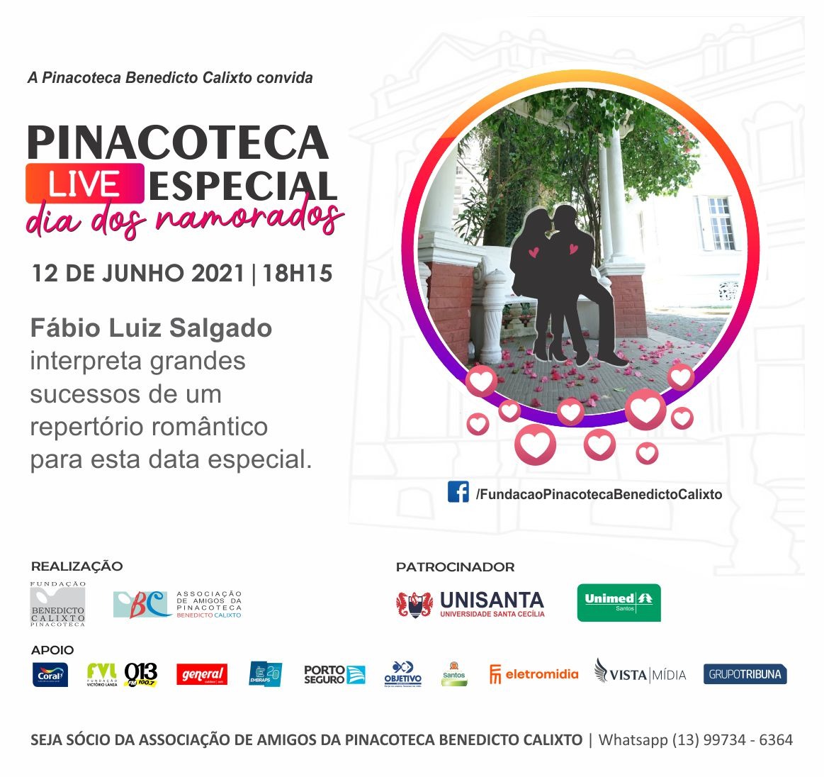 Voltar FVL segue como apoiadora dos eventos da PinacotecaFVL como apoiadora da Pinacoteca e participante de todos os eventos, antes presenciais e atualmente, devido à pandemia da Covid-19, participou da Live Especial do Dia dos Namorados com Fábio Luiz Salgado interpretando grandes sucessos de um repertório romântico transmitida pelo Facebook FundacaoPinacotecaBenedictoCalixto.