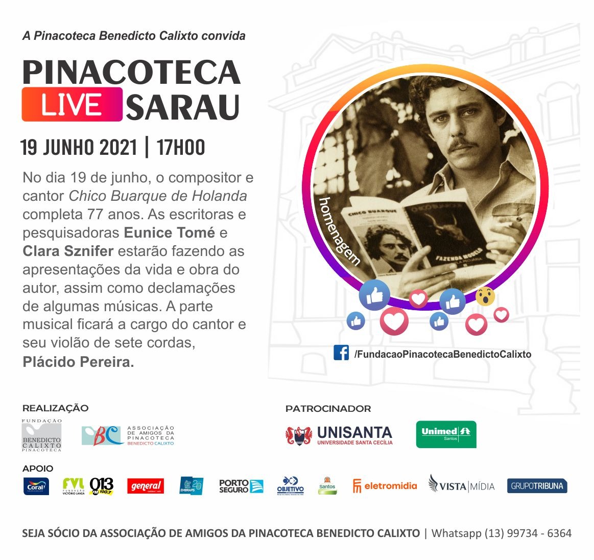 Voltar FVL no apoio de Live Sarau da PinacotecaA Fundação Victório Lanza no apoio da Pinacoteca homenageou o compositor e cantor Chico Buarque de Holanda que completou 77 (setenta e sete) anos. Para marcar a data, foi apresentado um Sarau na Fundação Pinacoteca Benedicto Calixto, onde foram exaltadas, não só a sua obra musical, mas outras vertentes por onde transitou, esse que é um dos mais importantes nomes da cultura brasileira, pois seus romances e peças de teatro também compõem a sua trajetória.
