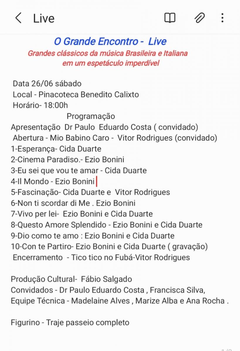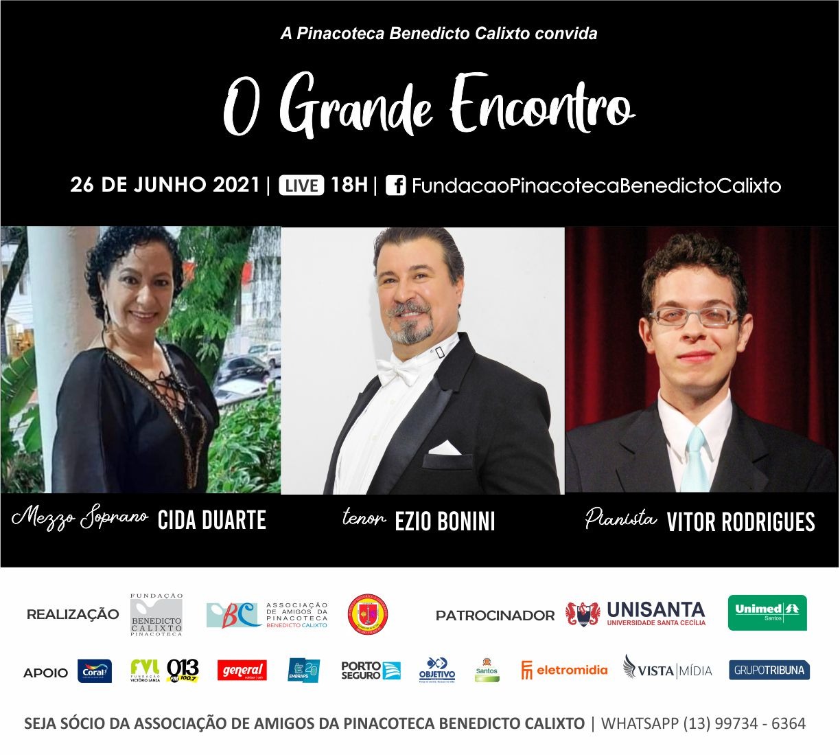 Voltar FVL e Pinacoteca na Live O GRANDE ENCONTROA FVL como apoiadora da Pinacoteca Benedicto Calixto e participante de todos os eventos, participou de O GRANDE ENCONTRO com a Mezzo Soprano Cida Duarte; o tenor Ezio Bonini e o pianista Vitor Rodrigues que aconteceu no dia 26 de junho de 2021, às 18horas - através de Live transmitida pelo Facebook da Pinacoteca: FundacaoPinacotecaBenedictoCalixto.