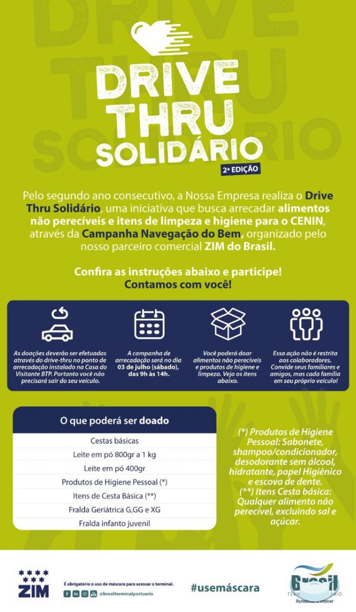 i. O doador não precisou sair de seu veículo, pois as doações foram efetuadas através do drive thru no ponto de arrecadação instalado na Caso do Visitante BTP (Brasil Terminal Portuário);