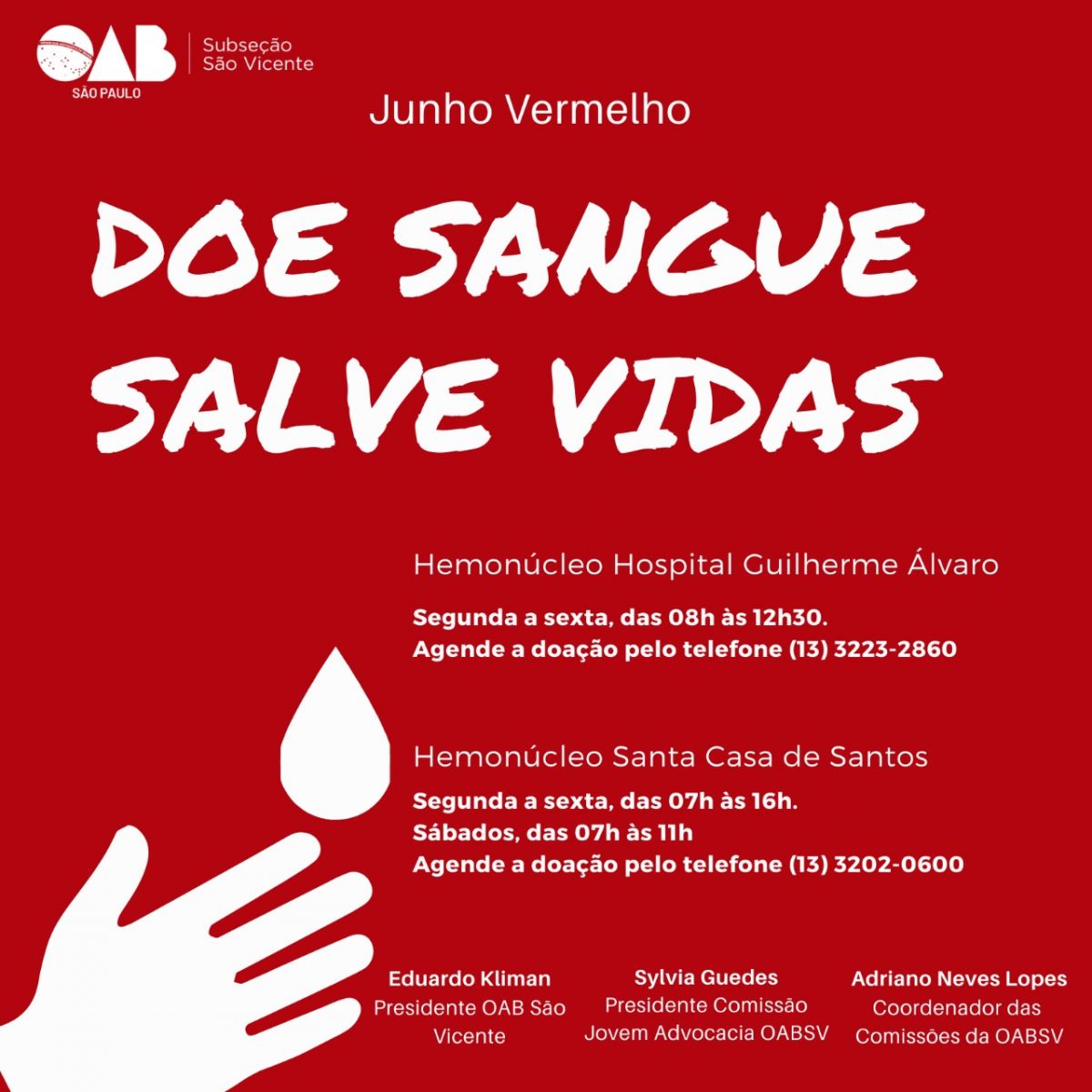 Voltar FVL no apoio da campanha Doe Sangue Salve VidasA Fundação Victório Lanza apoiou e divulgou a campanha "Junho Vermelho" de doação de sangue da Ordem dos Advogados do Brasil - Subseção São Vicente.