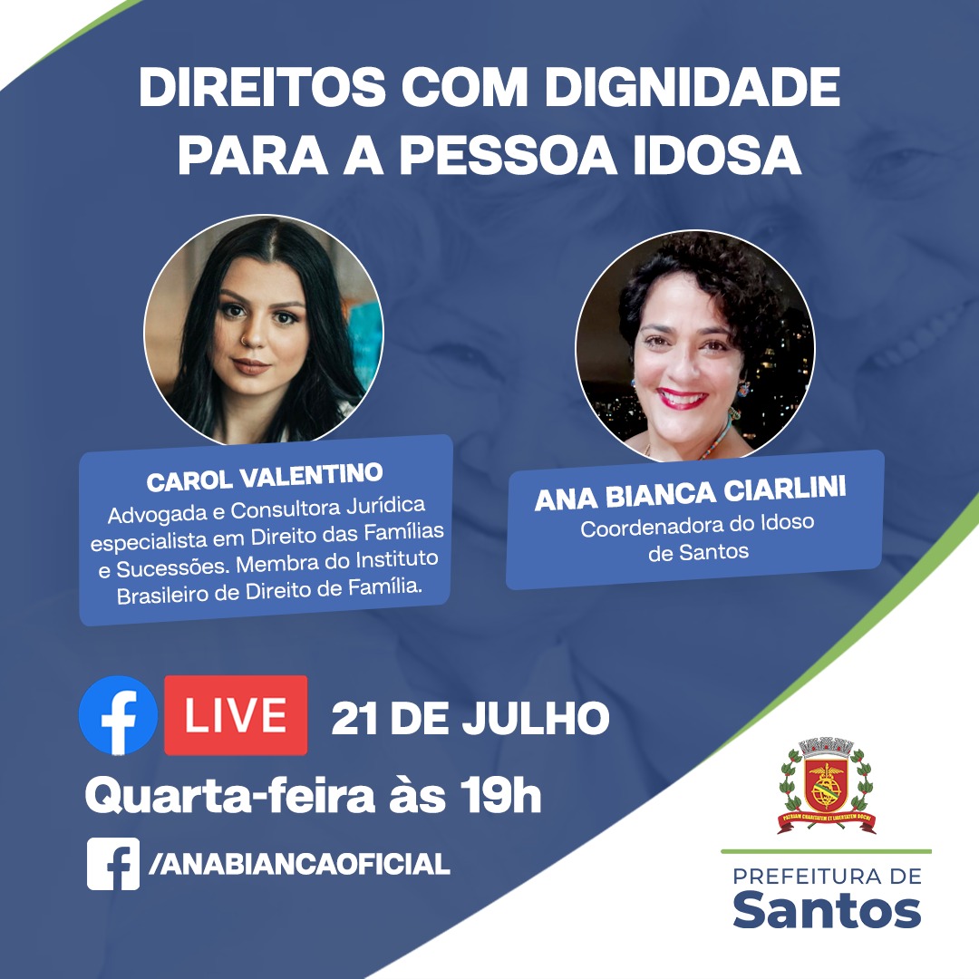 Ana Bianca Ciarlini é idealizadora do Projeto Vibra Vida, utiliza a dança e terapias corporais embasada no conceito do envelhecimento ativo e saudável e gestora da Vila Criativa 50+ (cinquenta mais) conversou com Carol Valentino que é advogada e consultora jurídica, especialista em Direito de Família e membro do Instituto Brasileiro de Direito de Família e abordaram o tema: Direitos com Dignidade para a Pessoa Idosa.