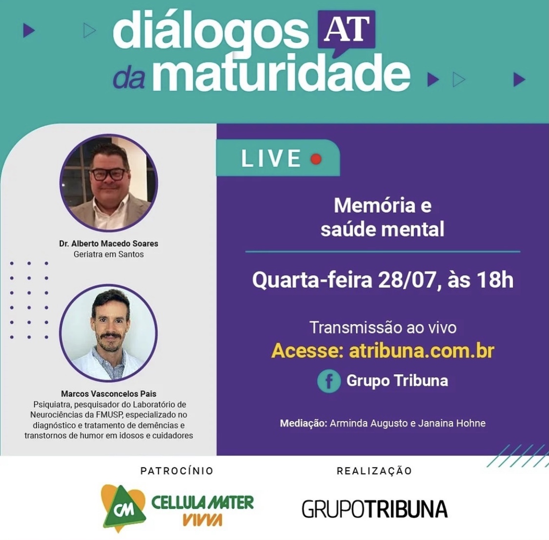 Voltar FVL participou como ouvinte de encontro virtualA FVL participou como ouvinte do encontro virtual que aconteceu no dia 28 de julho, às 18h00m - do projeto Diálogos da Maturidade, onde participaram o médico geriatra e professor universitário Alberto Macedo Soares e o psiquiatra Marcus Vasconcelos Pais, do Instituto de Psiquiatria do Hospital das Clínicas da Faculdade de Medicina da Universidade de São Paulo, o qual vem se dedicando aos estudos de biomarcadores da doença de Alzheimer, diagnóstico e tratamento de demências e transtornos de humor em idosos e cuidadores.