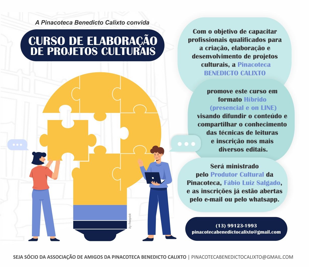 A Pinacoteca Benedicto Calixto promoverá o curso em formato híbrido (presencial e online), visando difundir o conteúdo e compartilhar o conhecimento das técnicas de leituras e inscrição nos mais diversos editais e será ministrado pelo produtor cultural da Pinacoteca, Fábio Luiz Salgado.