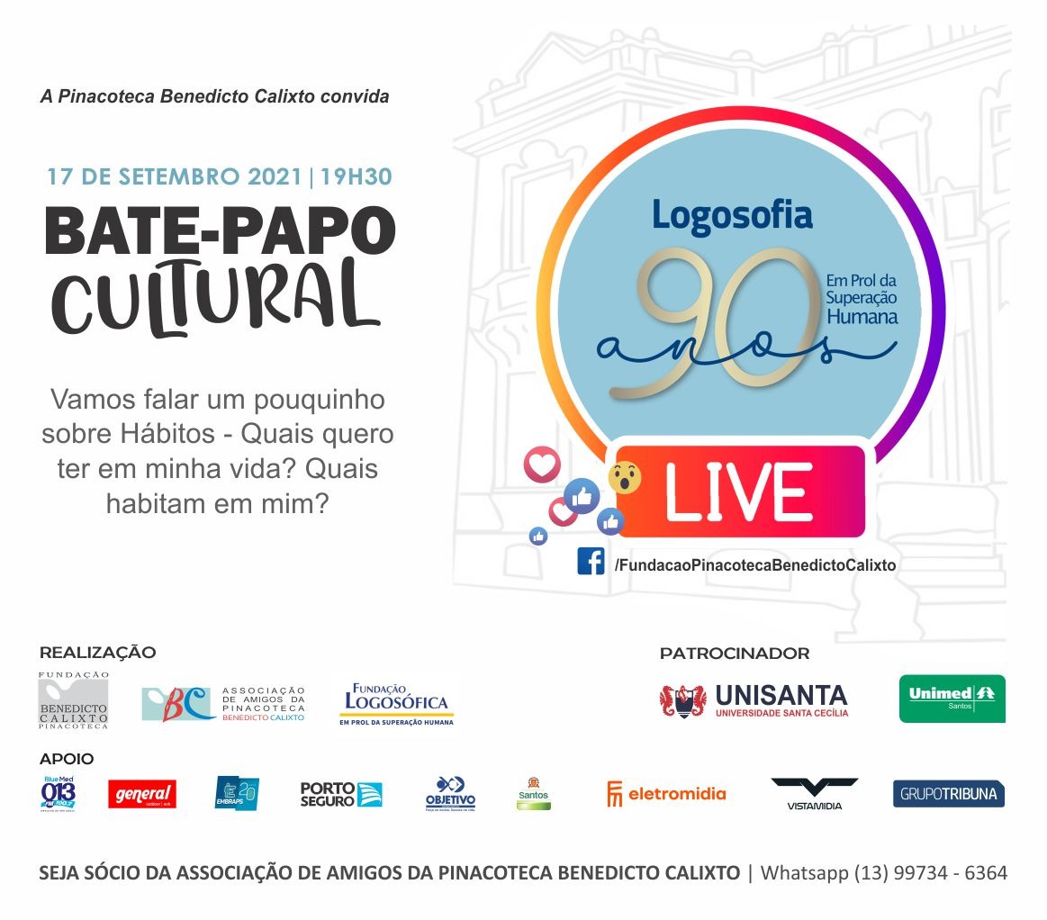 Voltar FVL e Pinacoteca em LiveA FVL sempre no apoio de todos eventos e projetos da Pinacoteca de Santos, participou de Live realizada em 17/09/21, às 19h30m de Bate-Papo Cultural, onde se falou sobre Hábitos.