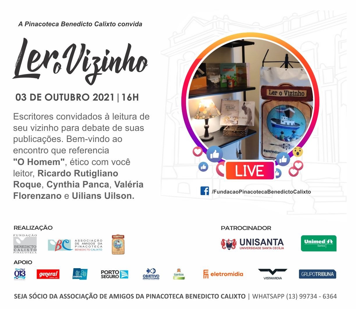 Voltar FVL em Ler o Vizinho com PinacotecaA FVL apoiou o projeto "Ler o Vizinho" que aconteceu na Pinacoteca de Santos em 03 de outubro de 2021, às 16 horas, onde escritores convidados à leitura de seu vizinho para debate de suas publicações.