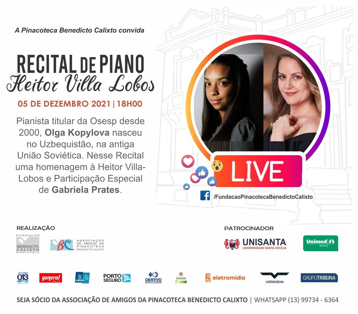 Voltar FVL apoiou Recital Heitor Villa-Lobos na PinacotecaA FVL apoiou no dia 05 de dezembro de 2021, o Recital Heitor Villa-Lobos que aconteceu no Salão Nobre da Pinacoteca Benedicto Calixto, como também através de live no Facebook da Pinacoteca: /FundacaoPinacotecaBenedictoCalixto.