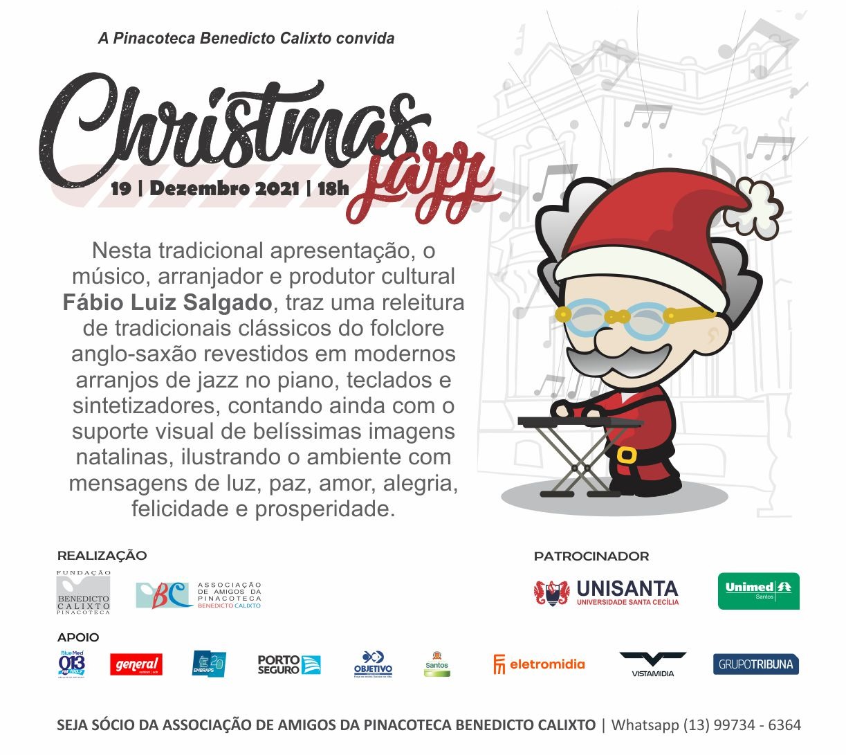 Na tradicional apresentação o músico, arranjador e produtor cultural, Fábio Luiz Salgado apresentou uma releitura de tradicionais clássicos do folclore anglo-saxão revestidos em modernos arranjos de jazz no piano, teclados e sintetizadores. Contou, ainda, com o suporte visual de belíssimas imagens natalinas ilustrando o ambiente com mensagens de luz, paz, alegria e prosperidade.