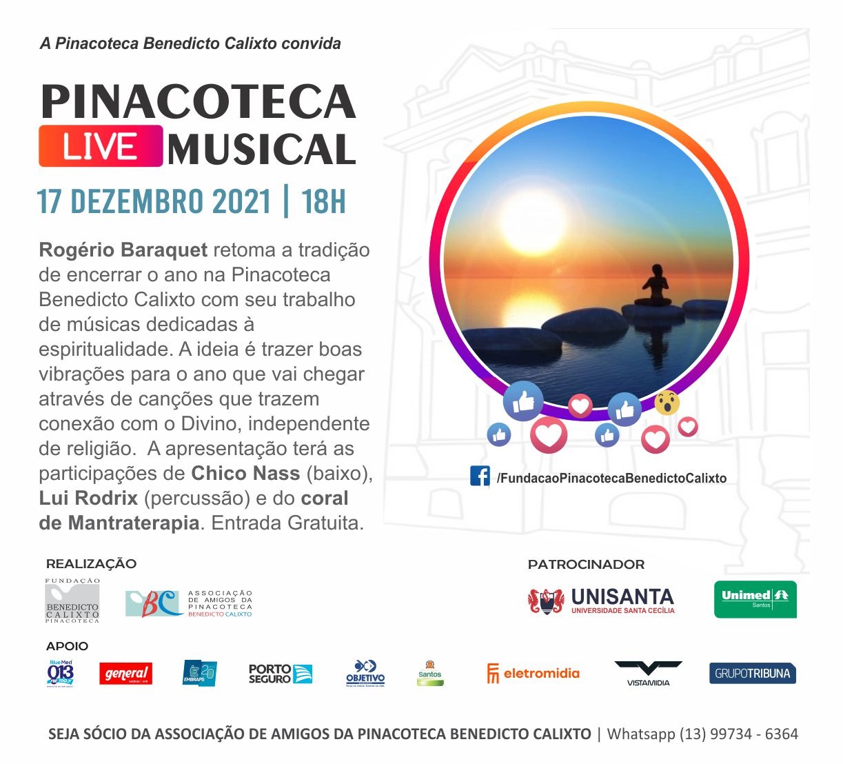 Com Rogério Baraquet que retomou a tradição de encerrar o ano na Pinacoteca Benedicto Calixto com seu trabalho de músicas dedicadas à espiritualidade. A ideia de trazer boas vibrações para o ano que está chegando através de canções que trazem conexão com o divino, independentemente de religião. A apresentação teve participação de Chico Nass (baixo), Lui Rodrix (percussão) e do coral de Mantraterapia. A entrada foi totalmente gratuita.