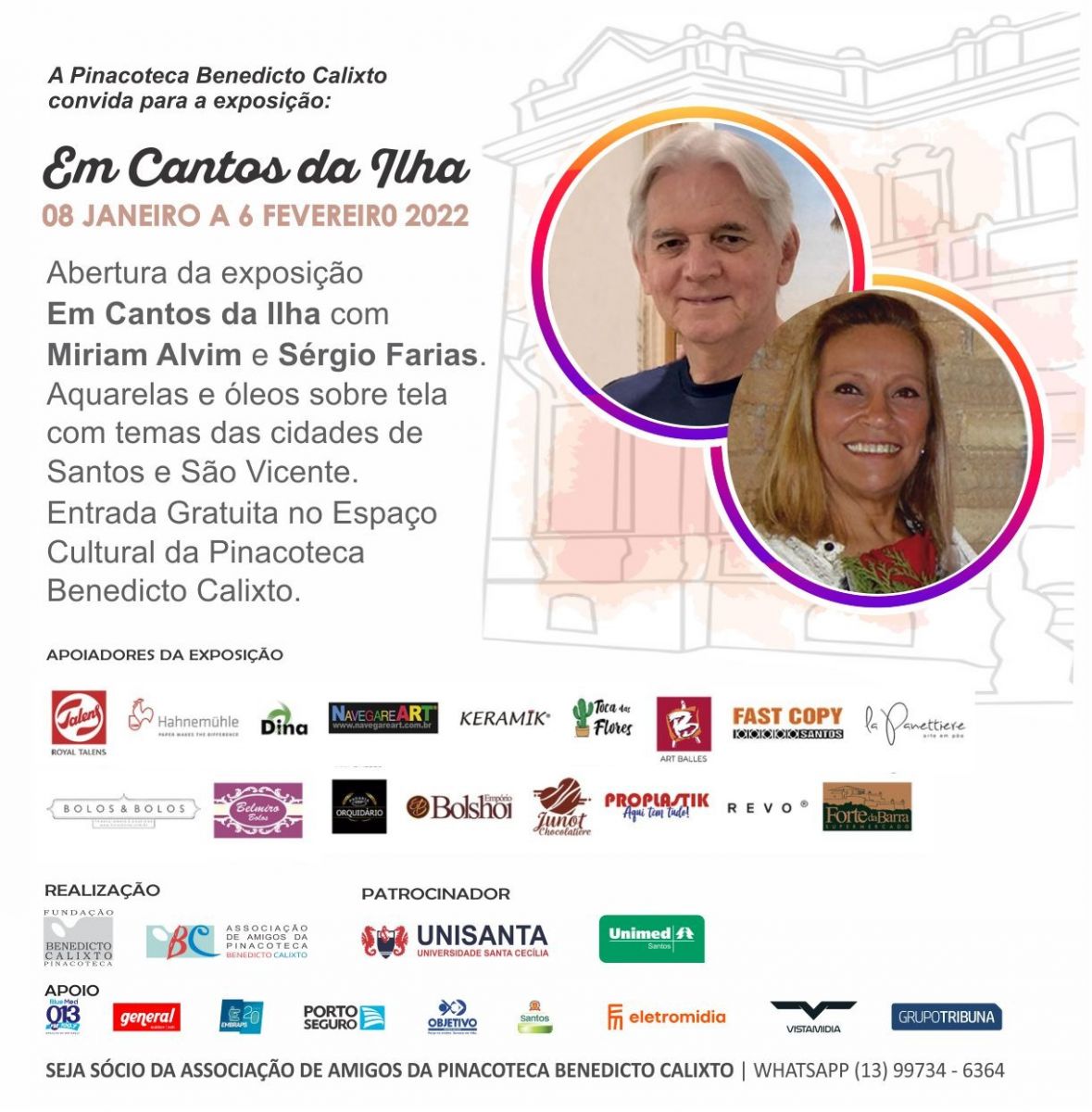 Voltar FVL no apoio de exposição na PinacotecaA Fundação Victório Lanza apoiou a Exposição "Em Cantos da Ilha" com Miriam Alvim e Sérgio Farias que aconteceu na Pinacoteca Benedicto Calixto de 08 de janeiro a 06 de fevereiro/22.