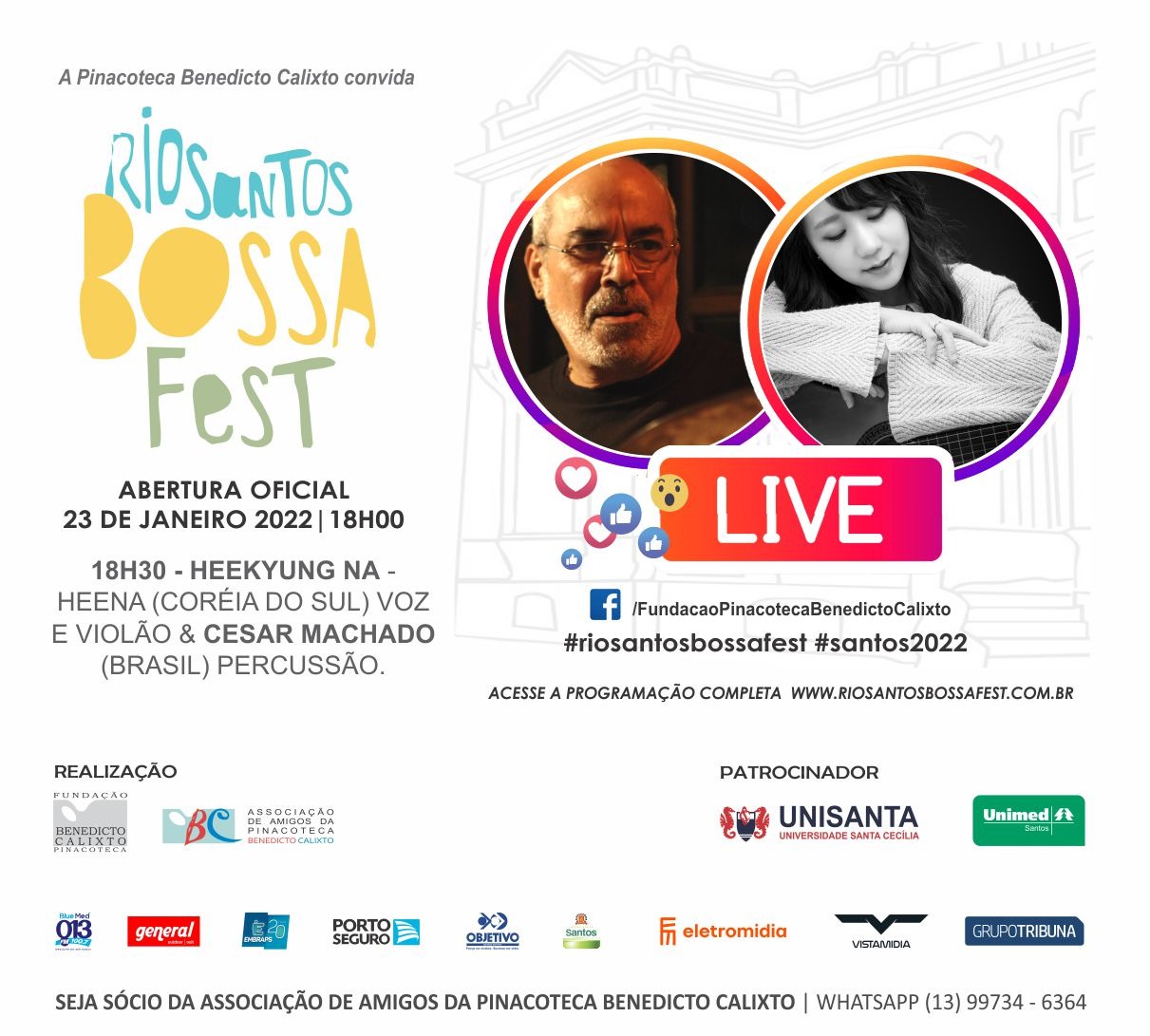 Voltar FVL apoiou abertura do Santos Rio Bossa FestA Fundação Victório Lanza apoiou, em 23 de janeiro/22, a abertura da Live musical "Rio Santos Bossa Fest" no Facebook da /FundacaoPinacotecaBenedictoCalixto.
