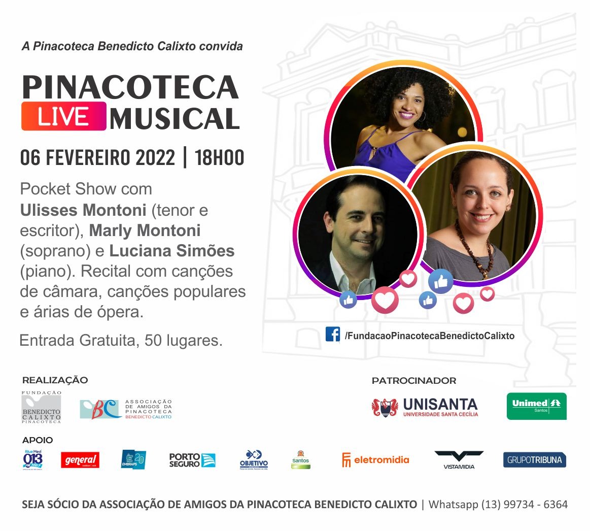 Recital com canções de câmara, canções populares e árias de ópera no Facebook da /FundacaoPinacotecaBenedictoCalixto.