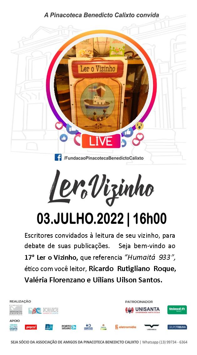 Todos os que quiseram participar puderam assistir, através das redes sociais da Fundação Pinacoteca Benedicto Calixto. Seja bem vindo ao 17o. ler o Vizinho, que referencia HUMAITÁ 933, ético com o leitor com Ricardo Rutigliano Roque e Valéria Florenzano e Uilians Uilson Santos.