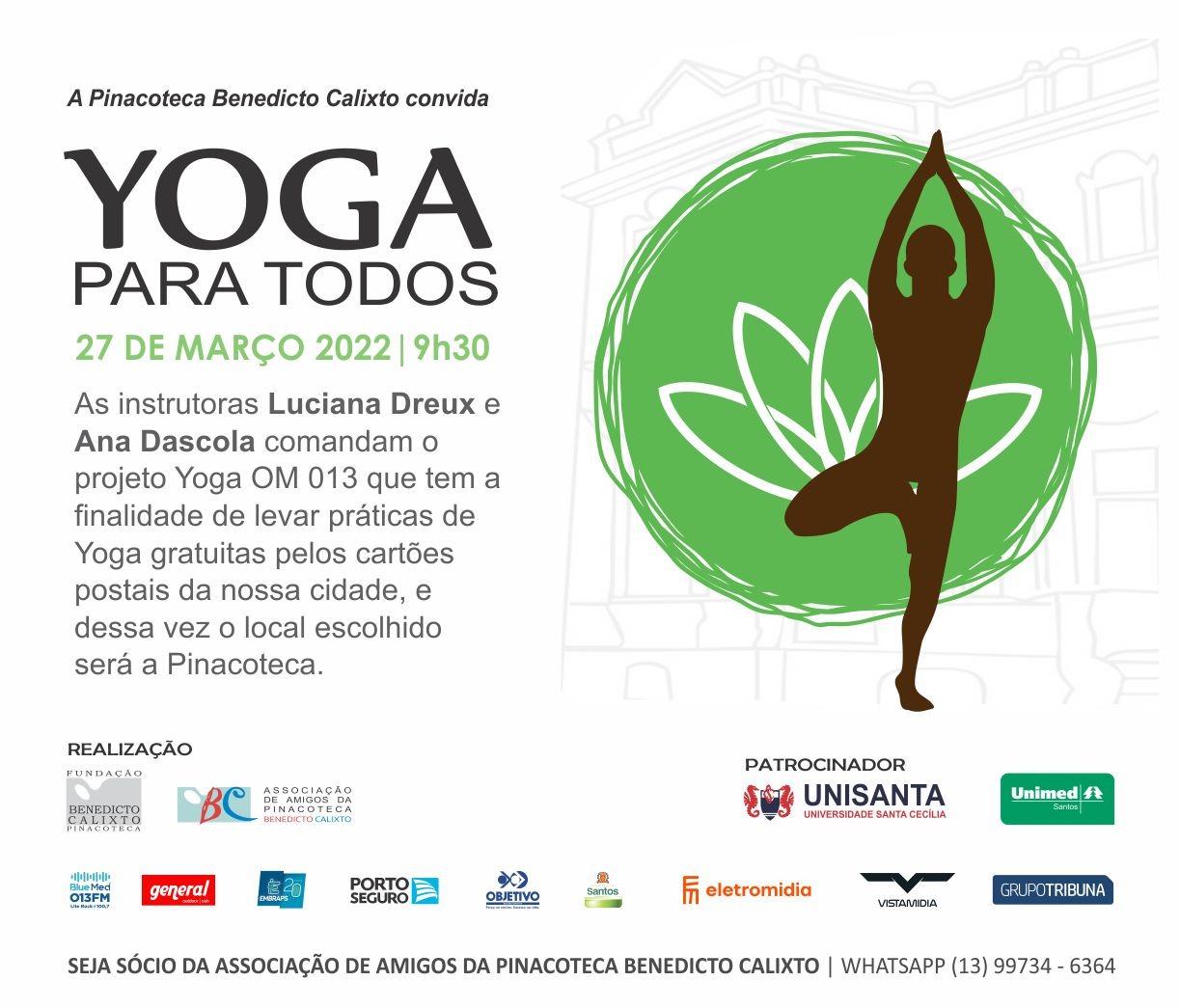 Yoga para Todos com as instrutoras Luciana Dreux e Ana Dascola que comandam o projeto Yoga OM 013 que tem a finalidade de levar práticas de Yoga gratuitas pelos cartões postais da cidade de Santos e desta vez o evento aconteceu na Pinacoteca Benedicto Calixto.
