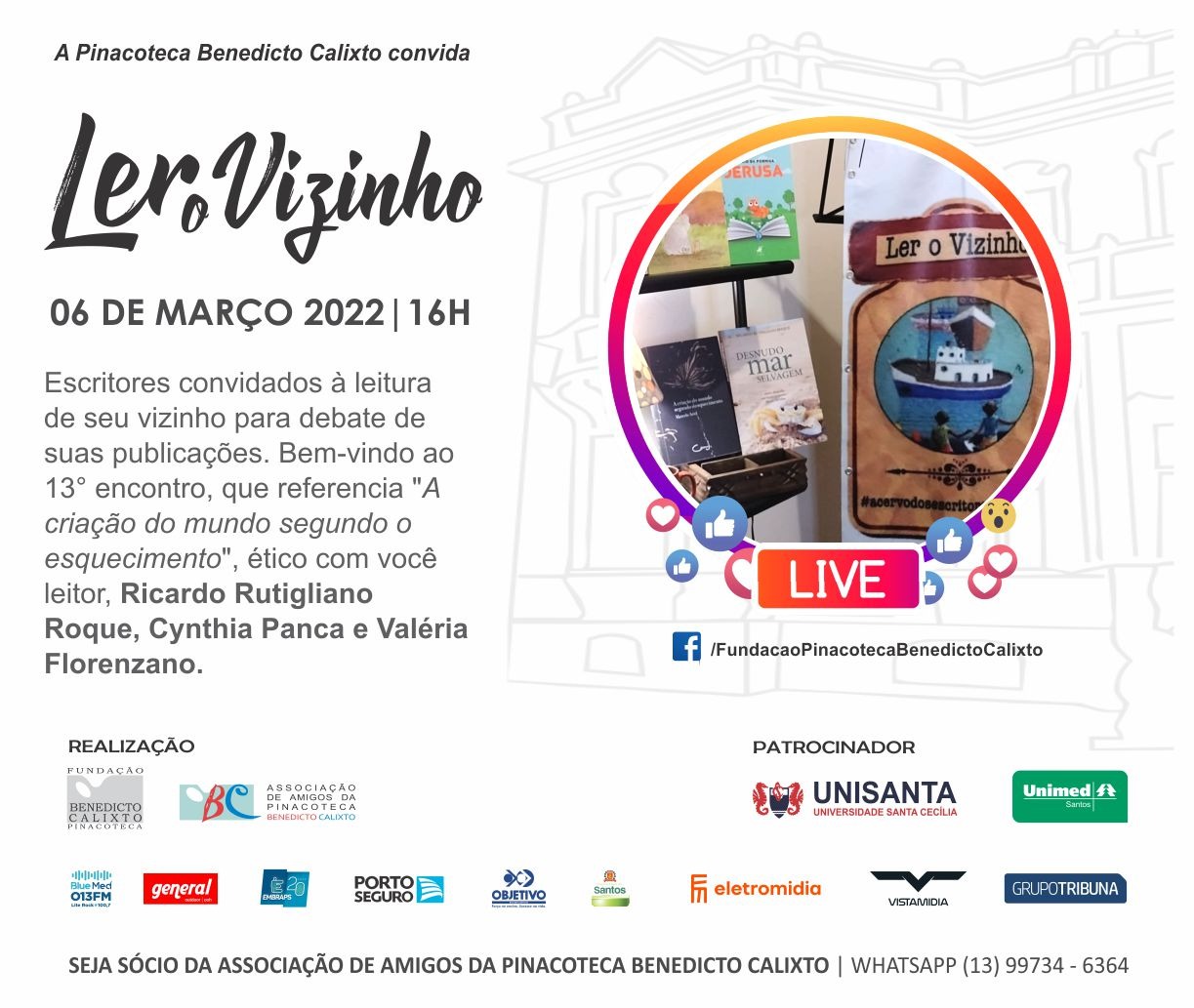 A Live foi realizada na Pinacoteca Benedicto Calixto em Santos com escritores convidados à leitura de seu vizinho para debate de suas publicações em 06 de março/22.