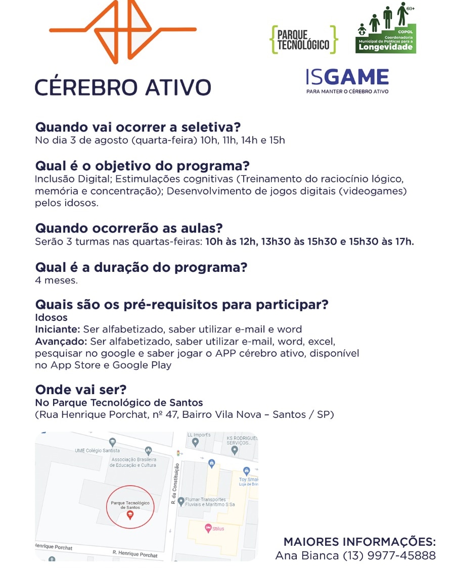 Voltar FVL no apoio do Programa Cérebro AtivoA FVL apoiou e divulgou o Programa Cérebro Ativo que aconteceu no Parque Tecnológico, na Rua Henrique Porchat n° 47 - Bairro Vila Nova em Santos.