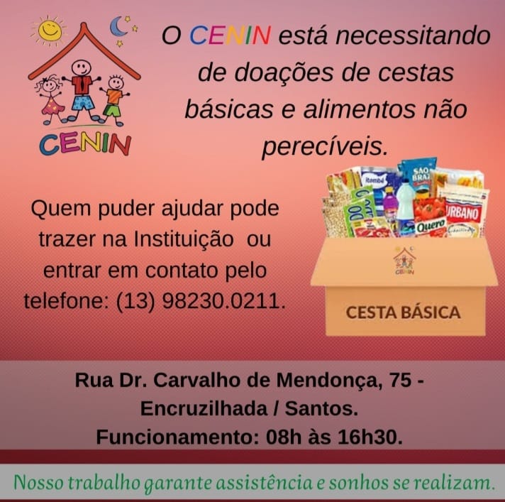 O Centro integrado de Assistência às Pessoas com Câncer, localizado à Rua Carvalho de Mendonça n° 75 - Encruzilhada - Santos (SP), pediu a doação de cestas básicas e alimentos não perecíveis para as crianças e adultos atendidos. As doações podem ser entregues no próprio CENIN de segunda à sexta-feira, das 8h0m às 16h30m.