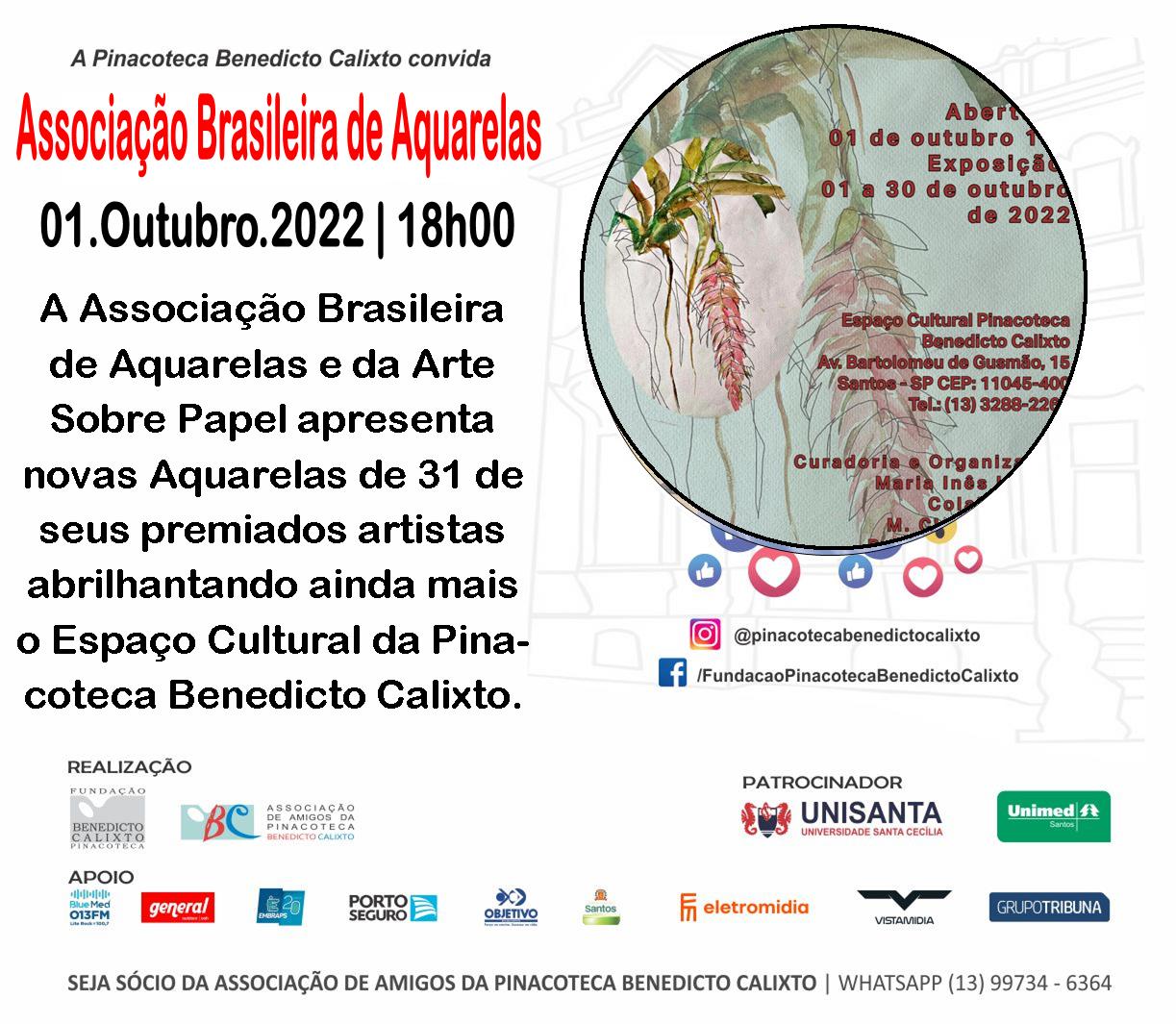 Voltar FVL apoiou novas aquarelas na PinacotecaA Fundação Victório Lanza apoiou, divulgou e convidou evento da Associação Brasileira de Aquarelas e da Arte sobre Papel que apresentou novas aquarelas de 31 (trinta e um) de seus premiados artistas abrilhantando ainda mais o Espaço Cultural da Pinacoteca Benedicto Calixto, em 01 de outubro de 2022, às 18h00m.