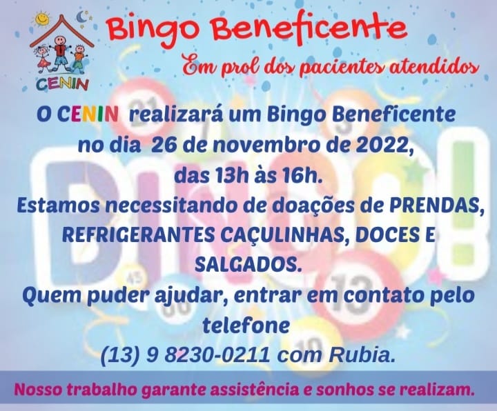Voltar FVL apoiou e divulgou ação do CENINA FVL apoiou e divulgou bingo beneficente, ação do CENIN em prol dos pacientes atendidos pela instituição, que aconteceu no dia 26 de novembro/22, das 13h00m às 16h00m.