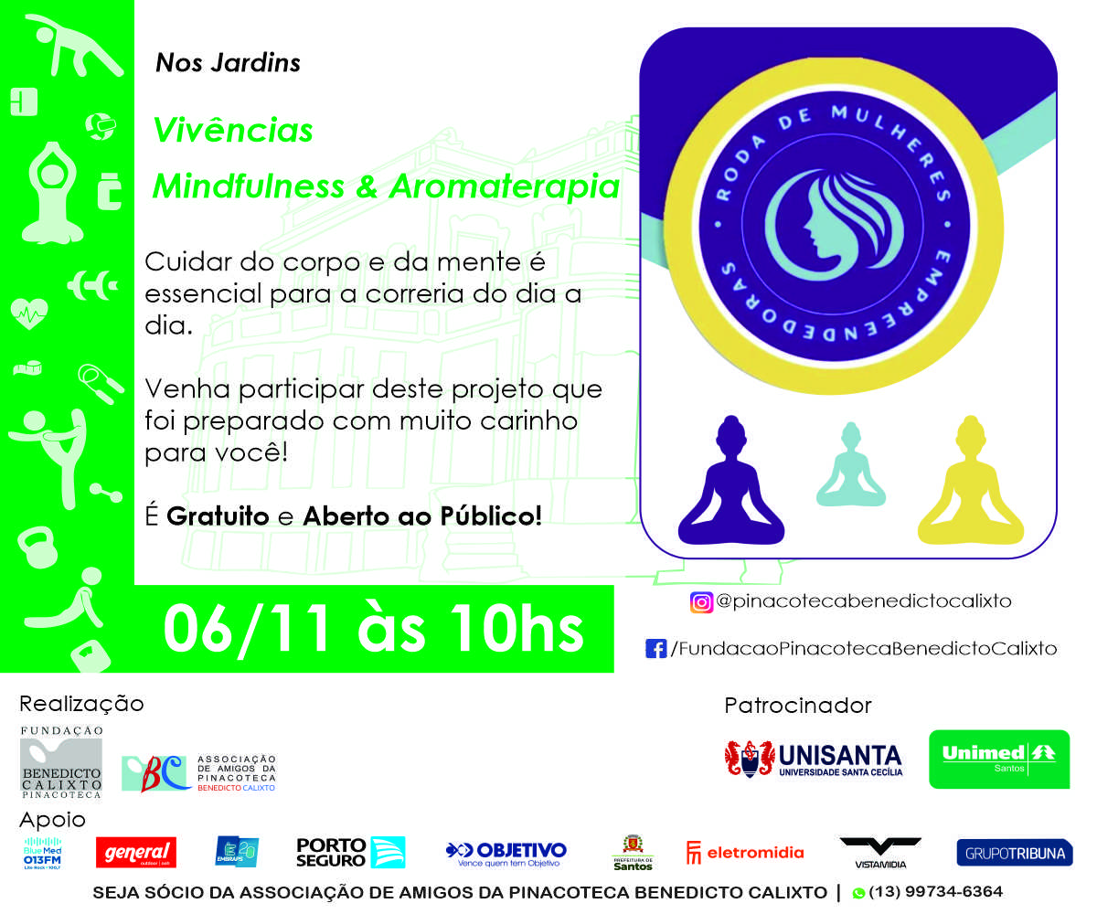 Voltar FVL apoiou Vivências nos Jardins da PinacotecaA Fundação Victório Lanza apoiou e divulgou Vivências - Mindfulness & Aromaterapia nos Jardins da Pinacoteca de Santos que aconteceu em 06.11.2022, às 10h00m.