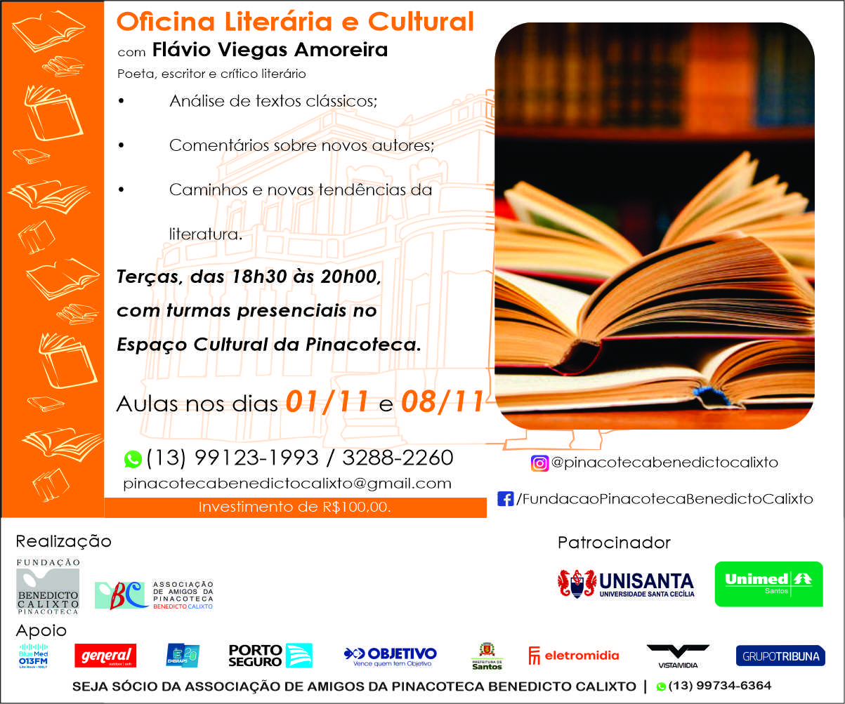 Voltar FVL no apoio de Oficina Literária e CulturalA Fundação Victório Lanza apoiou e divulgou Oficina Literária e Cultural na Pinacoteca de Santos com aulas nos dias 01 e 08 de novembro/22 - terças-feiras das 18h30m às 20h00m.