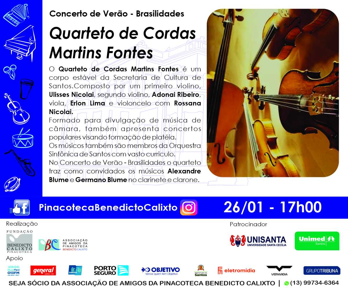 Voltar FVL no apoio de evento na PinacotecaA Fundação Victório Lanza apoiou e divulgou Quarteto Martins Fontes no Concerto de Verão - Brasilidades o quarteto traz como convidados os músicos Alexandre Blume e Germano Blume no clarinete e clarone.