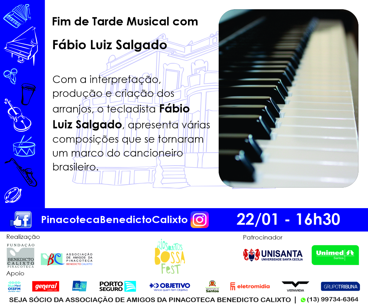 Voltar FVL no apoio de Fim de Tarde MusicalA Fundação Victório Lanza apoiou e divulgou, em 22.01.2023, às 16h30m, Fim de Tarde Musical com Fábio Luiz Salgado que aconteceu na Pinacoteca de Santos. Com a interpretação e criação dos arranjos, o tecladista apresentou várias composições que se tornaram um marco do cancioneiro brasileiro.