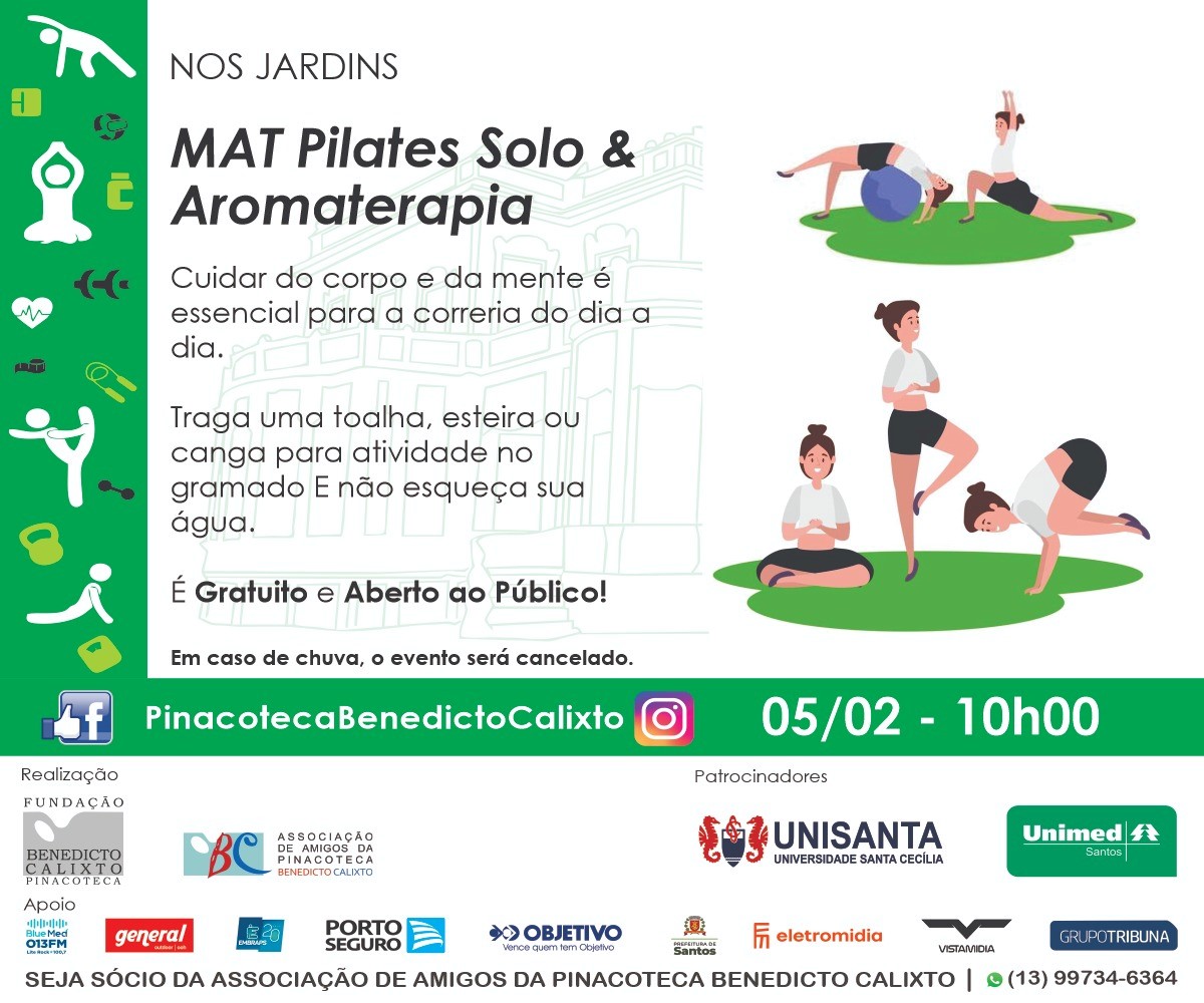 Voltar FVL apoiou MAT Pilates Solo e AromaterapiaA Fundação Victório Lanza apoiou e divulgou MAT Pilates Solo & Aromaterapia que aconteceu em 05.02.2023, às 10h00m nos jardins da Pinacoteca de Santos.