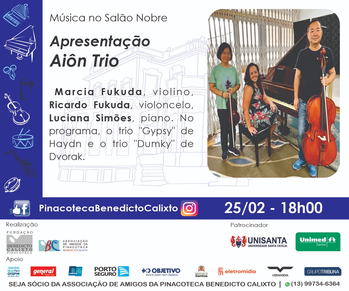 Voltar FVL no apoio de apresentação na PinacotecaA Fundação Victório Lanza apoiou e divulgou Apresentação Aiôn Trio que aconteceu em 25.02.2023, às 18h00m no Salão Nobre da Pinacoteca de Santos.