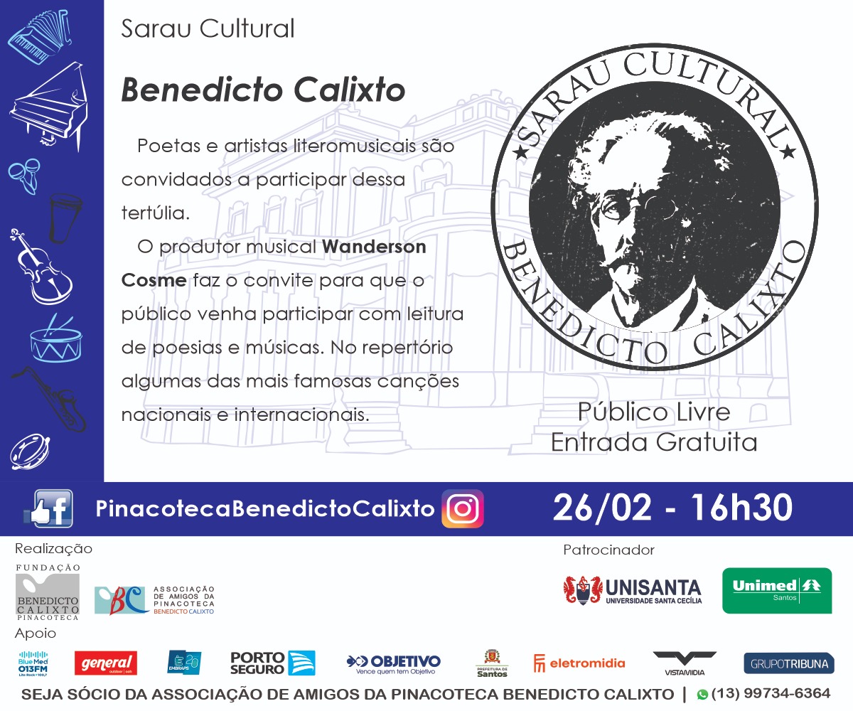 Voltar FVL no apoio de Sarau CulturalA Fundação Victório Lanza apoiou e divulgou Sarau Cultural Benedicto Calixto, que aconteceu em 26.02.2023, às 16h30m na Pinacoteca de Santos.