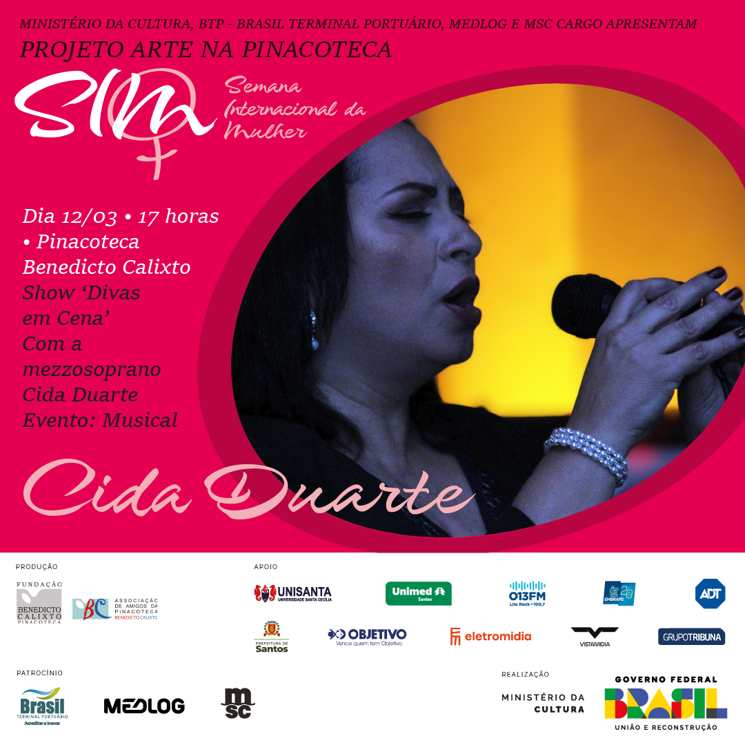 Voltar FVL no apoio do show Divas em Cena na PinacotecaA Fundação Victório Lanza apoiou e divulgou o show "Divas em Cena" com a mezzosoprano Cida Duarte, que aconteceu em 12.03.2023, às 17h00m na Pinacoteca de Santos.