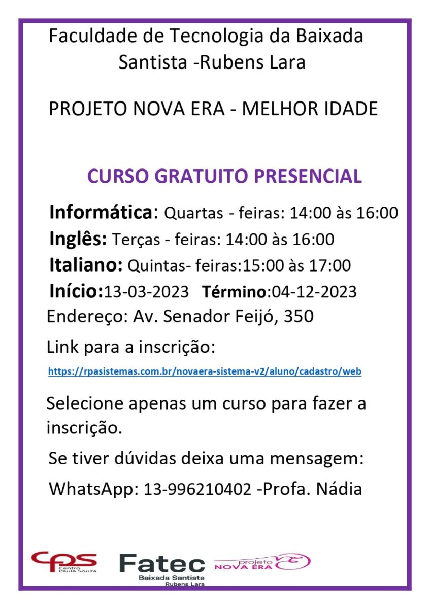Voltar FVL no apoio de curso gratuito presencialA Fundação Victório Lanza apoiou e divulgou curso gratuito presencial do Projeto Nova Era - Melhor Idade que teve início em 13/03/2023 e seguirá até 04/12/2023 na Faculdade de Tecnologia da Baixada Santista - Rubens Lara, localizada na Av. Senador Feijó, 350 - Santos (SP).