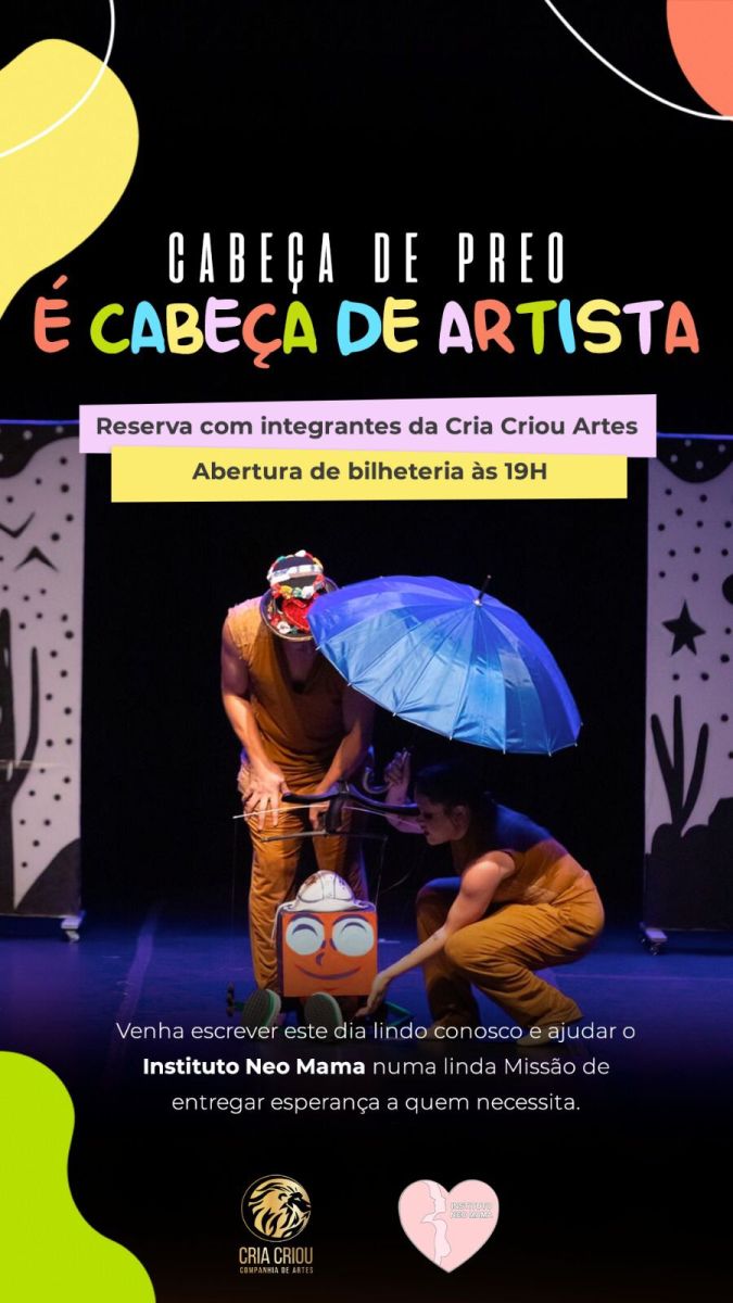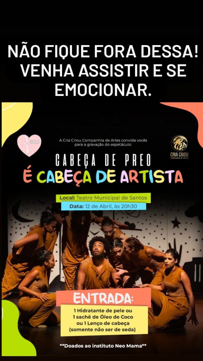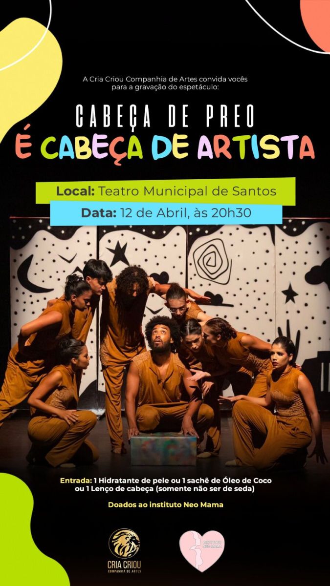 Voltar FVL apoiou evento em prol do Instituto Neo MamaA Fundação Victório Lanza apoiou e divulgou evento da Companhia de Artes Cria Criou que convidou para a gravação do espetáculo - Cabeça de Preo É Cabeça de Artista em prol do Instituto Neo Mama, que aconteceu em 12.04.2023 e teve início às 20h30m no Teatro Municipal de Santos.