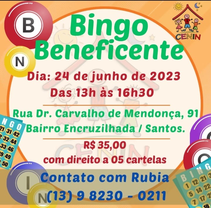 Voltar FVL apoiou e divulgou ação do CENINA FVL apoiou e divulgou Bingo Beneficente do Centro Integrado de Assistência à Pessoas com Câncer de Santos, que aconteceu no dia 24 de junho de 2023, das 13h00m às 16h30m na Rua Carvalho de Mendonça n° 91 - Encruzilhada - Santos (SP).
